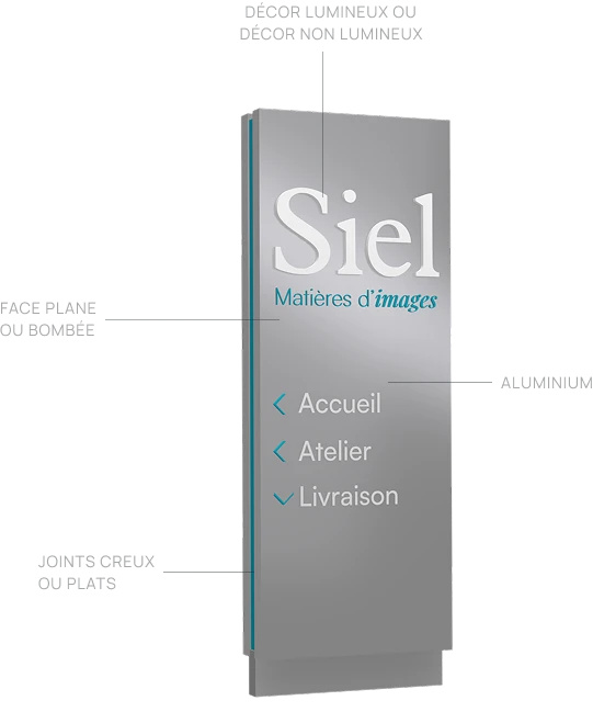 Chez SIEL, différents modèles de totems publicitaires existent pour mettre en avant votre image de marque, vos produits ou vos services. Grâce à des finitions de haute qualité, les totems publicitaires extérieurs et intérieurs sont personnalisables selon vos besoins : formes, dimensions, matériaux, design graphique…